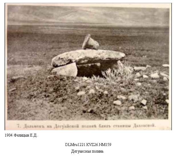1885 г. Шантр Э. опубликовал рисунки дольменов Дегуакской поляны, сделанных по фотографиям Фелицына Е.Д.