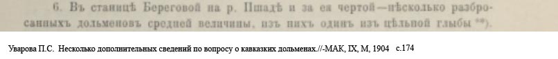 1888 г. Орешников А.В. указал монолитный дольмен в ст.Береговой, по сведениям Уваровой П.С.