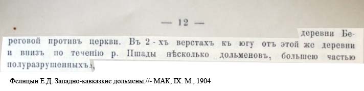 1904 г. Фелицын Е.Д. опубликовал фотографию крупного дольмена , на правом бергу р.Пшада в 2 верстах ниже ст.Береговой.