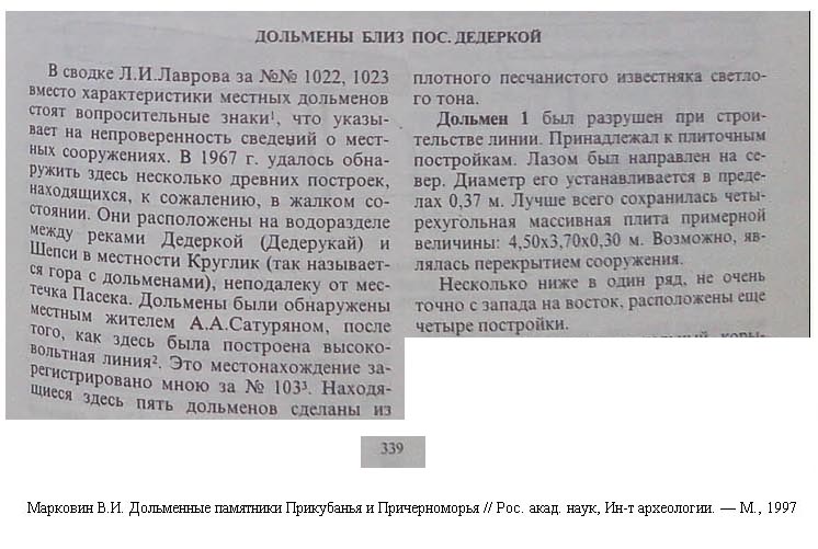 1978 г. Марковин В.И. указал 5 дольменов в местности Круглик, между реками Дедеркой и Шепси. Место указал пастух Сатурян А.А.(Марковин В.И.,1967)