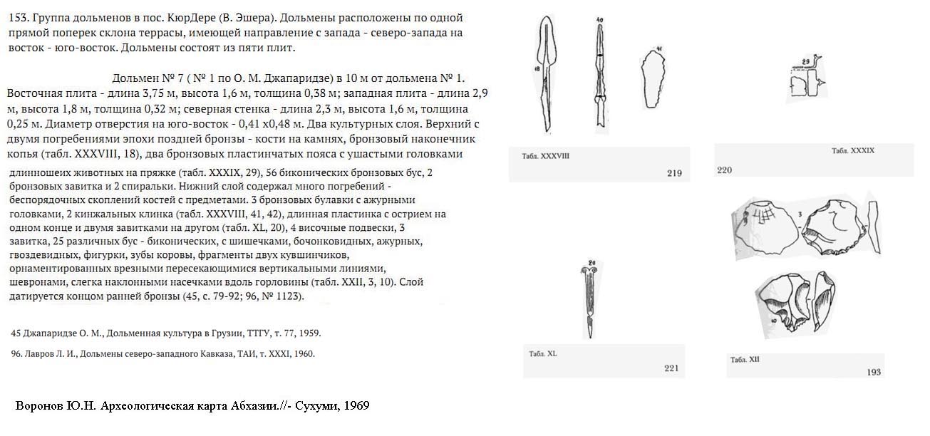 1969 г. Воронов Ю.Н. описал дольмен №1 по сведеньям Иващенко М.М., Куфтина Б.А., Лаврова Л.И. и Дольмен №6 по сведеньям Соловьева Л.Н.