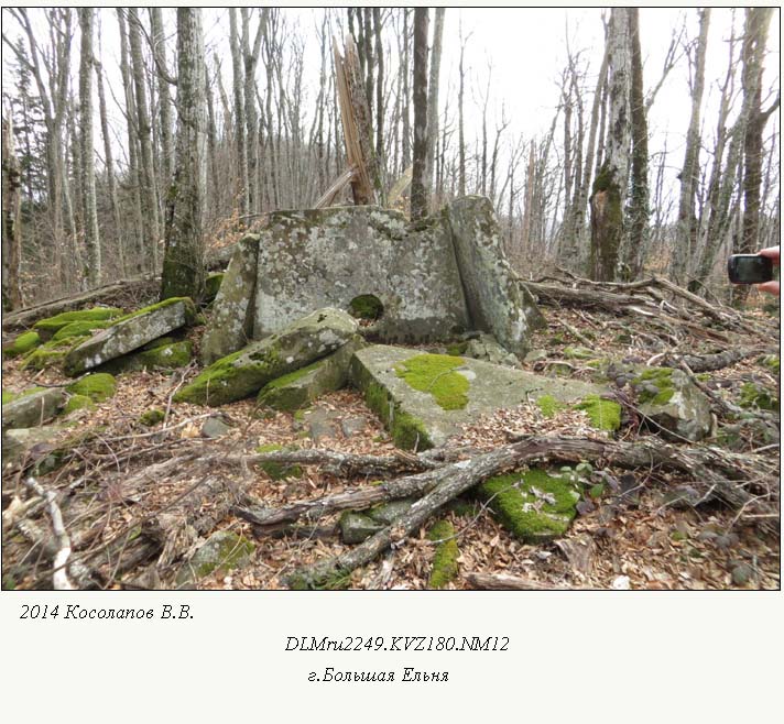 2012 г. Сороколетов А. опубликовал фото развала дольмена между Малой и Большой Ельней.