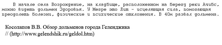 Коментарий: 2007 г. Косолапов В.В. указал дольмен в начале с. Возрождения, р. Ачибис, на армянском кладбище