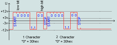 UART использует уровни сигналов -12в....+12в . Зона нечувствительности, то есть отсутствие сигналов считается напряжение -3в...+3в. При этом обратите внимания, что принимаемые/передаваемые данные инвертированы.